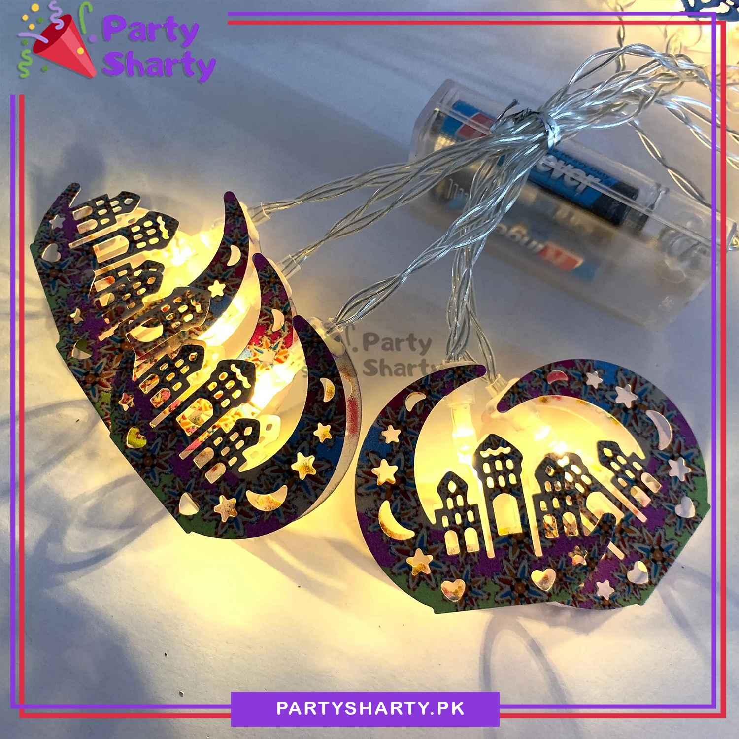 Ramadan Kareem Printed Crescent with Masjid Floral Print Shaped Led Metal String Light For Ramadan Decoration And Celebration