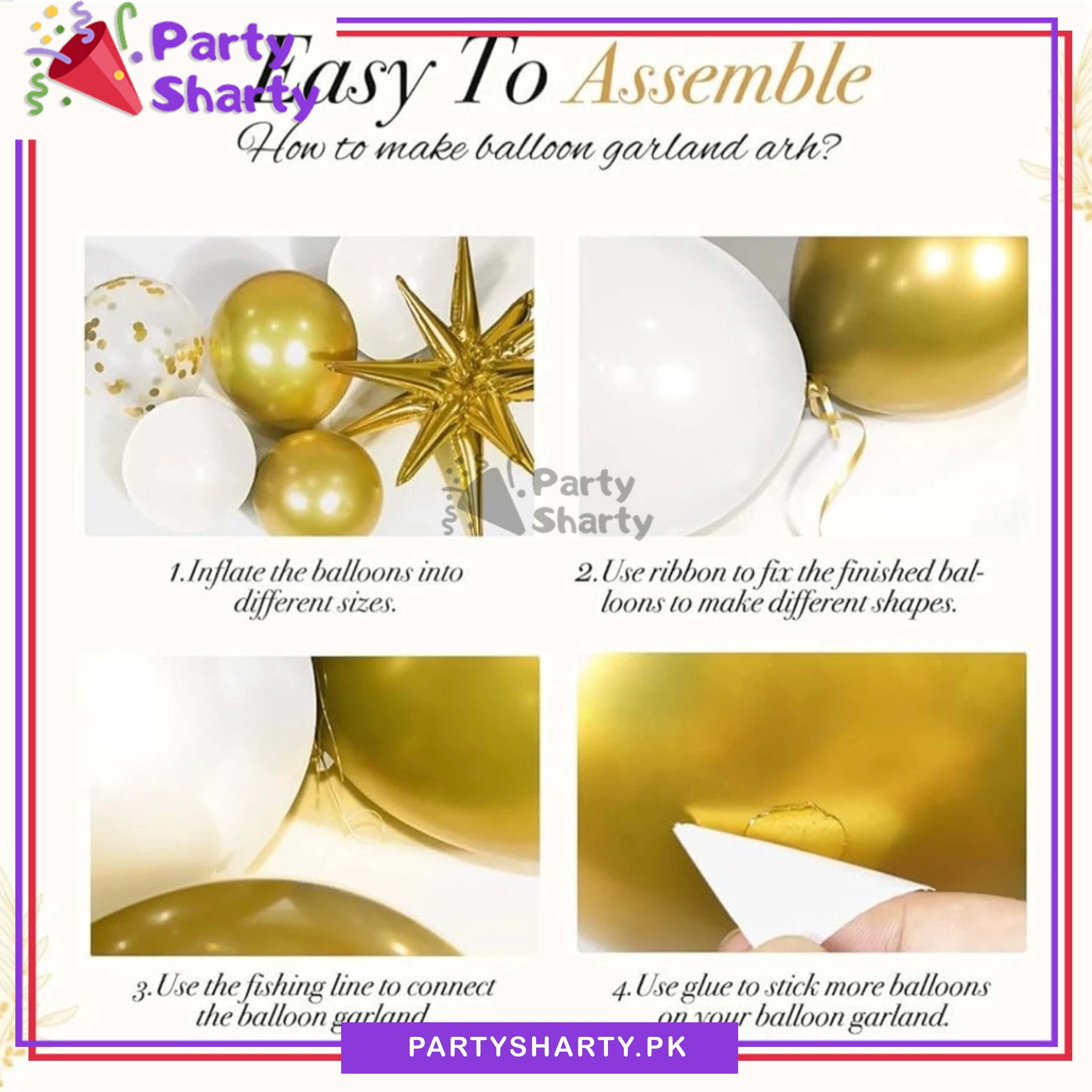 - Package includes: 3pcs Golden Explosion Star Foil Balloons + 18inches 4pcs Latex / Metallic Balloons (White & Golden Mixed) + 12inches 8pcs Golden Confetti Balloons + 10inches 40pcs Latex/Metallic Balloons (White & Metallic Golden mixed) + 5inches 45pcs Latex Balloons (White & Metallic Golden mixed) + Arch Tape + Dotted Tape