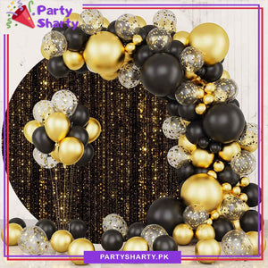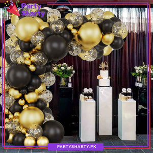 - Party Decoration Kit includes: 18 inches 4pcs Latex / Metallic Balloons (Black & Golden Mixed) + 12 inches 22pcs Latex/Metallic Balloons (Black & Golden Mixed) + 10 inches 20pcs Latex/Metallic Balloons (Black & Golden Mixed) + 5 inches 40pcs Latex/Metallic Balloons (Black & Golden Mixed) + 12 inches 12pcs Golden Confetti Balloon + Arch Tape + Dotted Glue Tape.