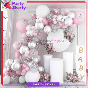 100pcs Butterfly Theme Baby Pink, White & Metallic Silver Balloon Garland Arch Kit For Party Event Decoration