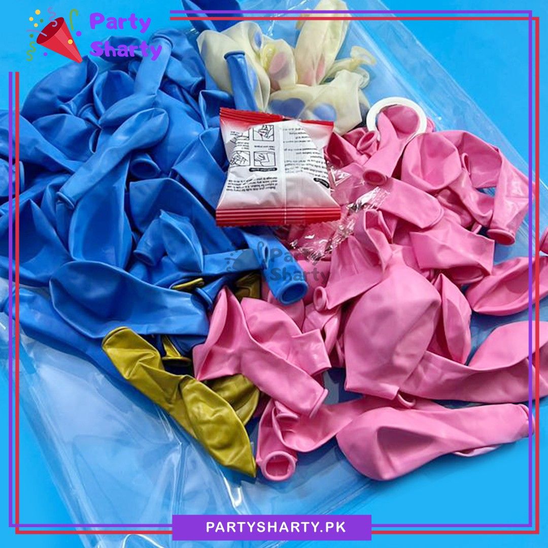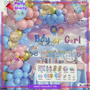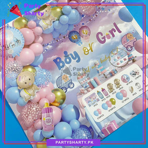 - Package Include: 1pc Back Drop Poster Boy Or Girl theme (22x30inches) + 2pcs 28inches Crawling Baby Foil Balloons (Baby Girl & Boy) + 2pcs 12inches Feeder Shape foil Balloons (Pink & Blue) + 1pc 18inches Round Boy or Girl Printed Foil Balloons + 6pcs 12inches Confetti Balloons (Pink & Blue mixed) + 20pcs 5inches Latex Balloons (Baby Pink & Blue) + 55pcs 10inches Latex Balloons (Baby Pink, Blue & Golden Metallic Mixed) + 12pcs 12inches Latex balloons (Baby Pink & Blue mixed) + Arch Tape + Dotted Glue Sheet