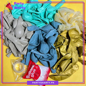 - Package includes: 12inches 20pcs Latex Balloons (Dusty Blue, Sea Green, Sand White & Golden Metallic Mixed) + 12inches 12pcs Golden Confetti Balloons + 10inches 46pcs Latex Balloons (Dusty Blue, Sea Green, Sand White & Golden Metallic Mixed) + 5inches 20pcs Latex Balloons (Dusty Blue, Sea Green, Sand White & Golden Metallic Mixed) + Arch Tape + Dotted Glue Tape