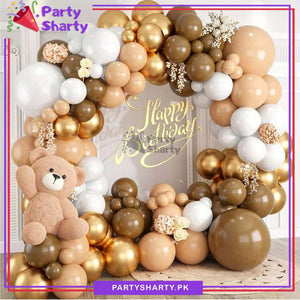 - Package includes: 18inches 3pcs Latex Balloons (Mocha Brown, Apricot & White mixed) + 12inches 20pcs Latex/Metallic Balloons (Mocha Brown, Apricot, White & Metallic Golden mixed) + 10inches 55pcs Latex/Metallic Balloons (Mocha Brown, Apricot, White & Metallic Golden mixed) + 5inches 20pcs Latex Balloons (Mocha Brown, Apricot, White & Metallic Golden mixed) + Arch Tape + Dotted Tape