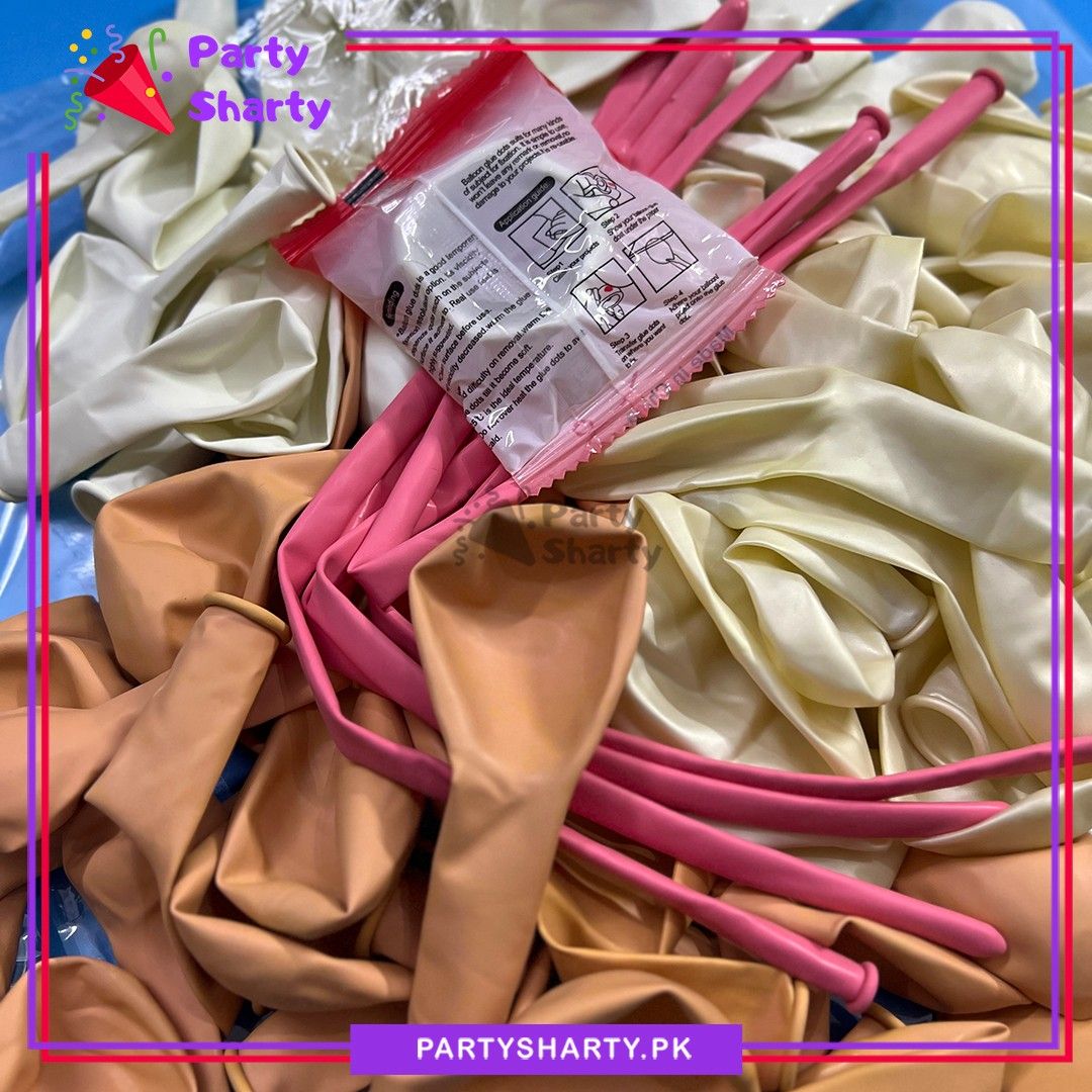 - Package includes: 1pc 21inches Caramel Color Explosion Star Foil Balloon + 3pcs 18inches Bobo Transparent Balloon + 6pcs Modeling Balloons (Baby Pink Color) + 20pcs 5inches Latex balloons (Pearl White, White & Apricot Mixed) + 57pcs 10inches Latex Balloons (Pearl White, White & Apricot Mixed) + 10pcs 12inches Latex Balloons (Pearl White, White & Apricot Mixed) + Arch Tape + Dotted Glue Tape + Ribbon