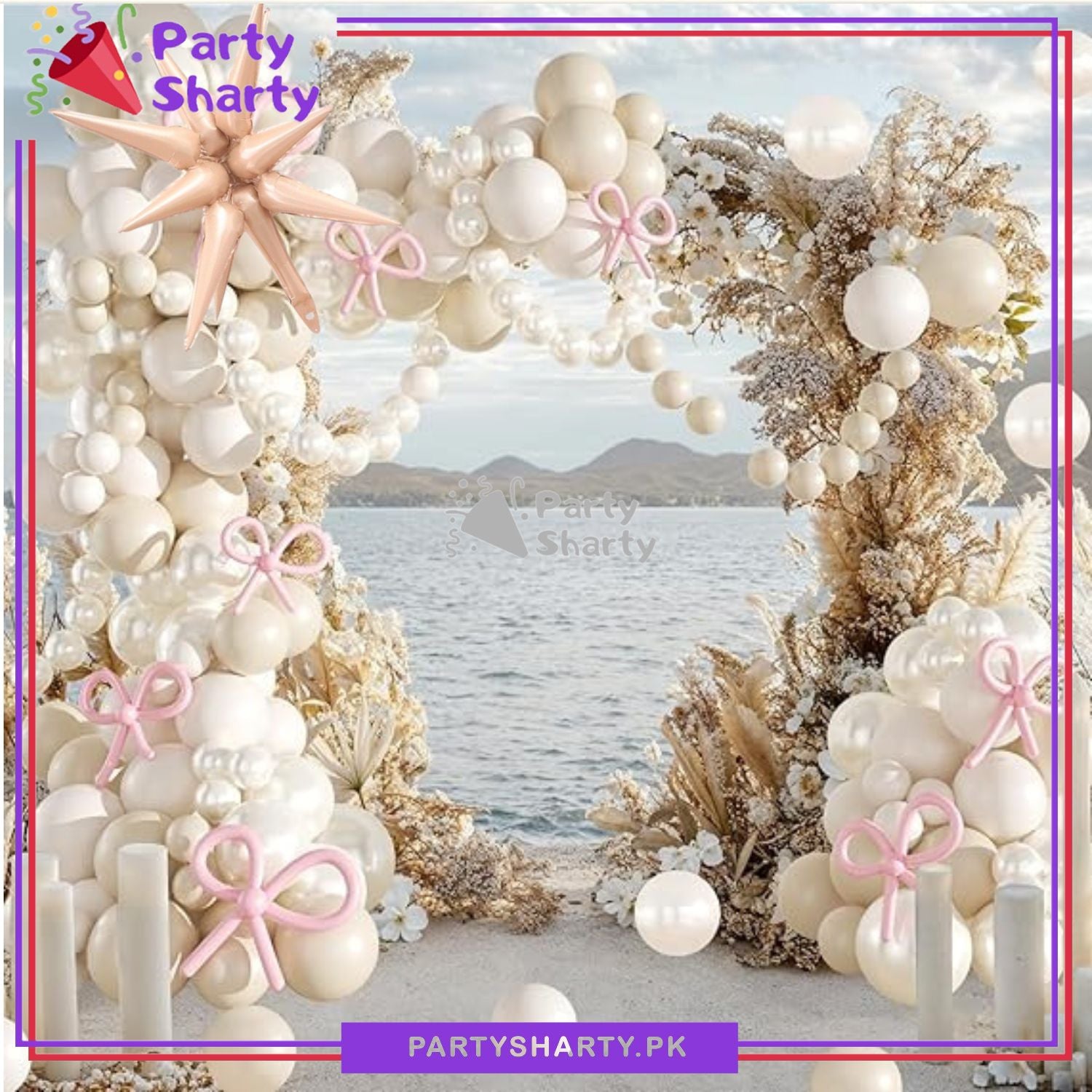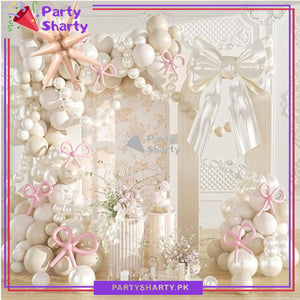 - Creative Pink Bow Long Balloons with Sand White, Pearl White & White Balloons Themed design which is attractive and popular.