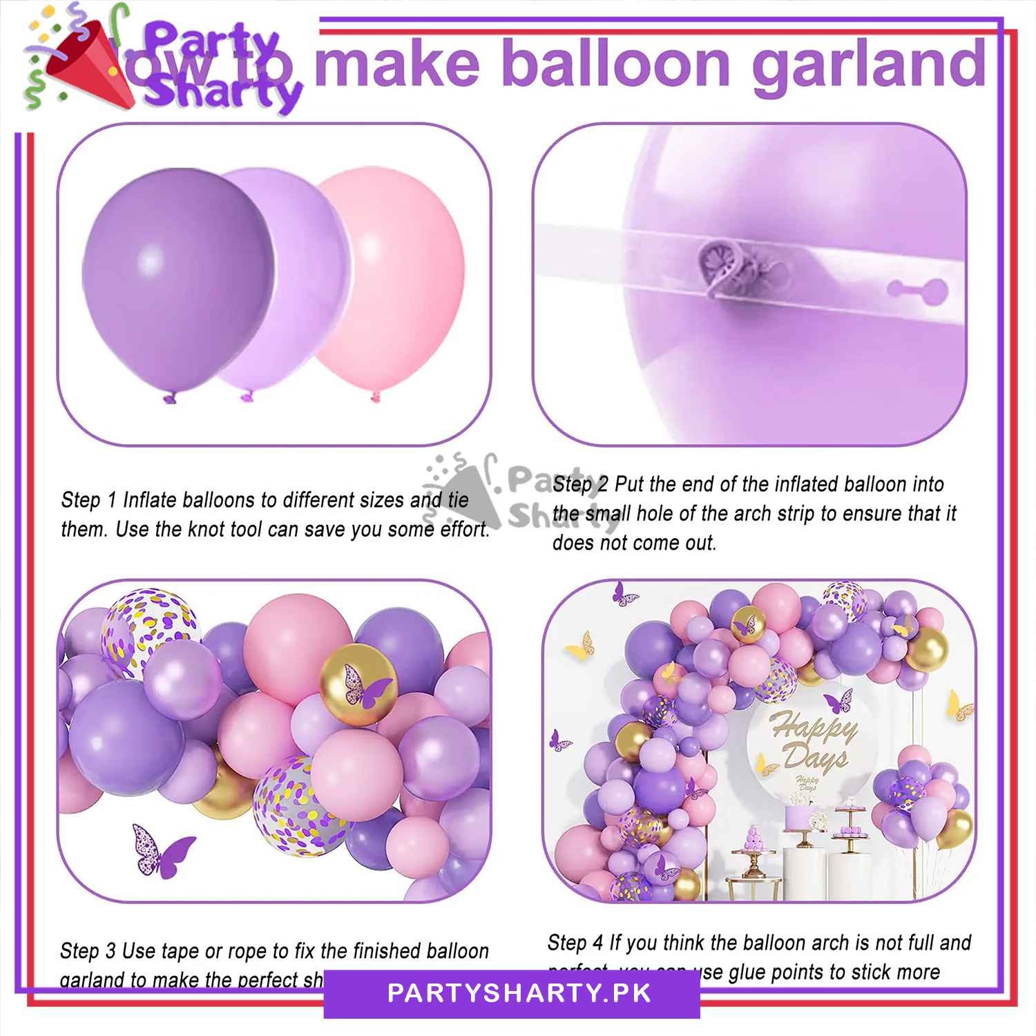 - Package Include: 5pcs Confetti Filled Latex Balloons (Purple) + 12inches 15pcs Latex Balloons (Baby Pink, Purple & Pastel Purple Mixed) + 10 inches 44pcs Latex Balloons (Golden, Baby Pink, Purple & Pastel Purple Mixed) + 5 inches 22pcs Latex Balloons (Baby Pink & Purple Mixed) + 12pcs 3D Butterflies (Golden & Purple Mixed) + Arch Tape + Dotted Glue Tape