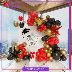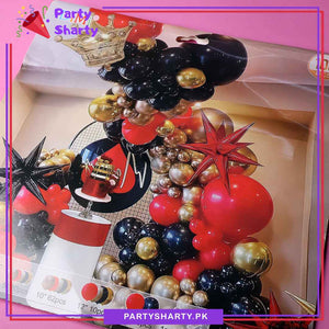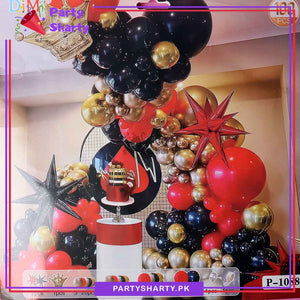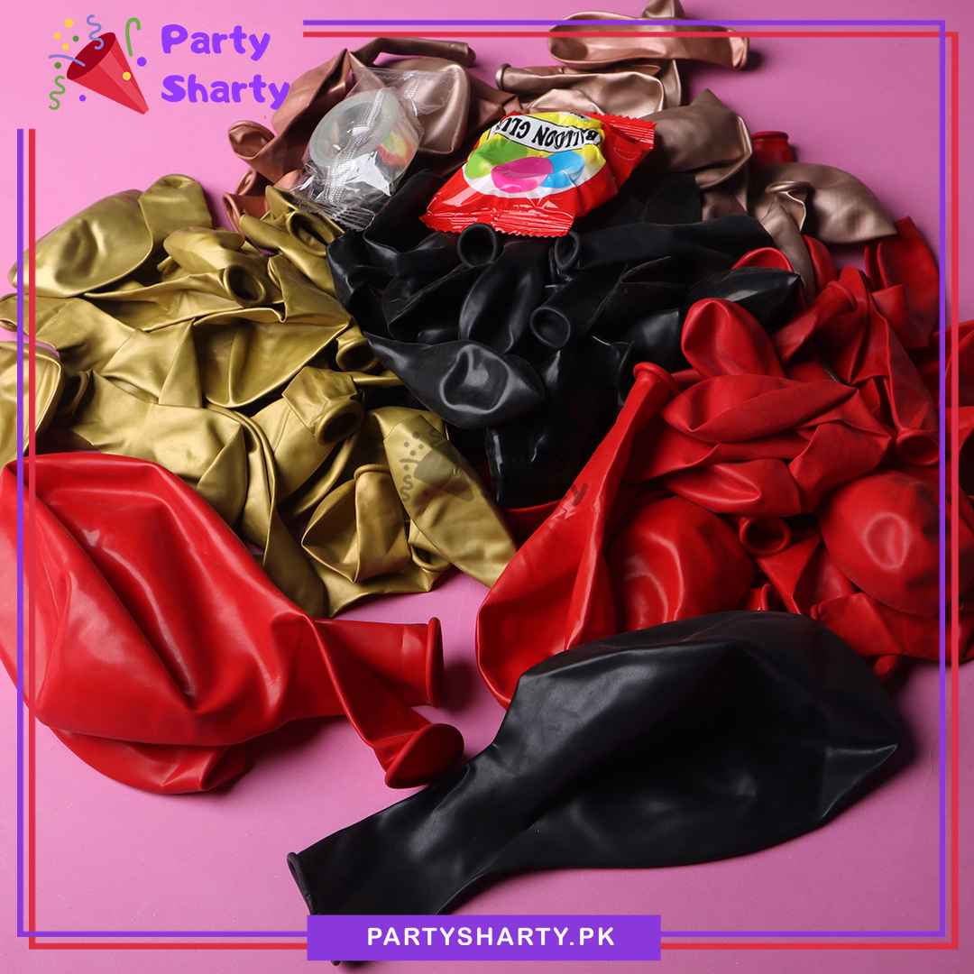 - Party Decoration Kit includes: 18 inches 3pcs Latex Balloons (Red & Black Mixed) + 12 inches 10pcs Latex/Metallic Balloons (Red, Rose Gold, Golden & Black Mixed) + 10 inches 62pcs Latex/Metallic Balloons (Red, Rose Gold, Black & Golden Mixed) + 5 inches 20pcs Latex/Metallic Balloons (Red, Black, Rose Gold & Golden Mixed) + 22 inches 2pcs Water Drop Explosion Foil Balloon (Red & Black) + 1pc Large Golden Crown Foil Balloon + Arch Tape + Dotted Glue Tape.