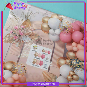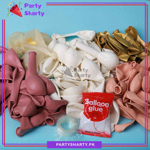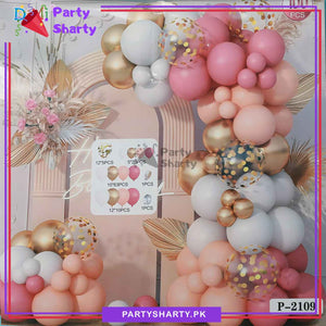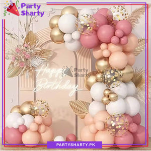 - Package includes: 12inches 5pcs Golden Confetti Balloons + 12inches 10pcs Latex/Metallic Balloons (Retro Pink, Apricot, White & Metallic Golden mixed) + 10inches 63pcs Latex/Metallic Balloons (Retro Pink, Apricot, White & Metallic Golden mixed) + 5inches 20pcs Latex Balloons (Retro Pink, Apricot, White & Metallic Golden mixed) + Arch Tape + Dotted Tape.
