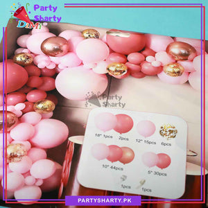 - Package includes: 18inches 3pcs Latex Balloons (Retro Pink & Baby Pink mixed) + 12inches 15pcs Latex Balloons (Baby Pink) + 12inches 6pcs Golden Confetti Balloons + 10 inches 44pcs Latex/Metallic Balloons (Retro Pink, Baby Pink & Metallic Rose Gold mixed) + 5inches 30pcs Latex Balloons (Retro Pink & Baby Pink Mixed) + Arch Tape + Dotted Tape