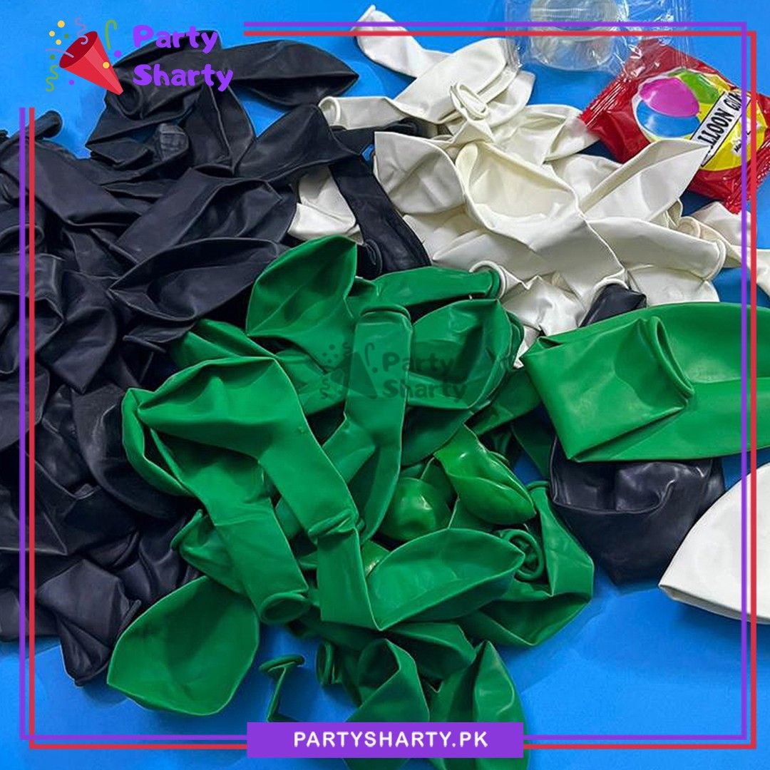 - Package Include: 3pcs 18inches Latex Balloons (Green, White & Black) + 4pcs 10inches 4D Orbz Foil Balloons (Silver) + 71pcs 10inches Latex Balloons (White, Green & Black Mixed) + 20pcs 5inches Latex Balloons (White, Green & Black Mixed) + Arch Tape + Dotted Tape