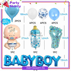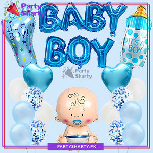 - Package Include: Baby Boy Letter Foil Banner + 1pc Small Feeder Shaped Foil Balloon (Size: Approx. 12 inches) + 1pc Small Feet Shaped Foil Balloon (Size: Approx.12 inches) + 1pc Large Baby Boy Shaped Foil Balloon (Size: Approx.26 inches) + 2pcs Heart Shaped Foil Balloons (Size: Approx. 18 inches) + 4pcs Blue Confetti Filled Balloons + 4pcs Blue Latex Balloons + 4pcs White Latex Balloons + Ribbon