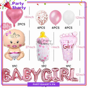 - Package Include: Baby Girl Letter Foil Banner + 1pc Small Feeder Shaped Foil Balloon (Size: Approx. 12 inches) + 1pc Small Feet Shaped Foil Balloon (Size: Approx.12 inches) + 1pc Large Baby Girl Shaped Foil Balloon (Size: Approx. 26 inches) + 2pcs Heart Shaped Foil Balloons (Size: Approx. 18 inches) + 4pcs Pink Confetti Filled Balloons + 4pcs Pink Latex Balloons + 4pcs White Latex Balloons + Ribbon
