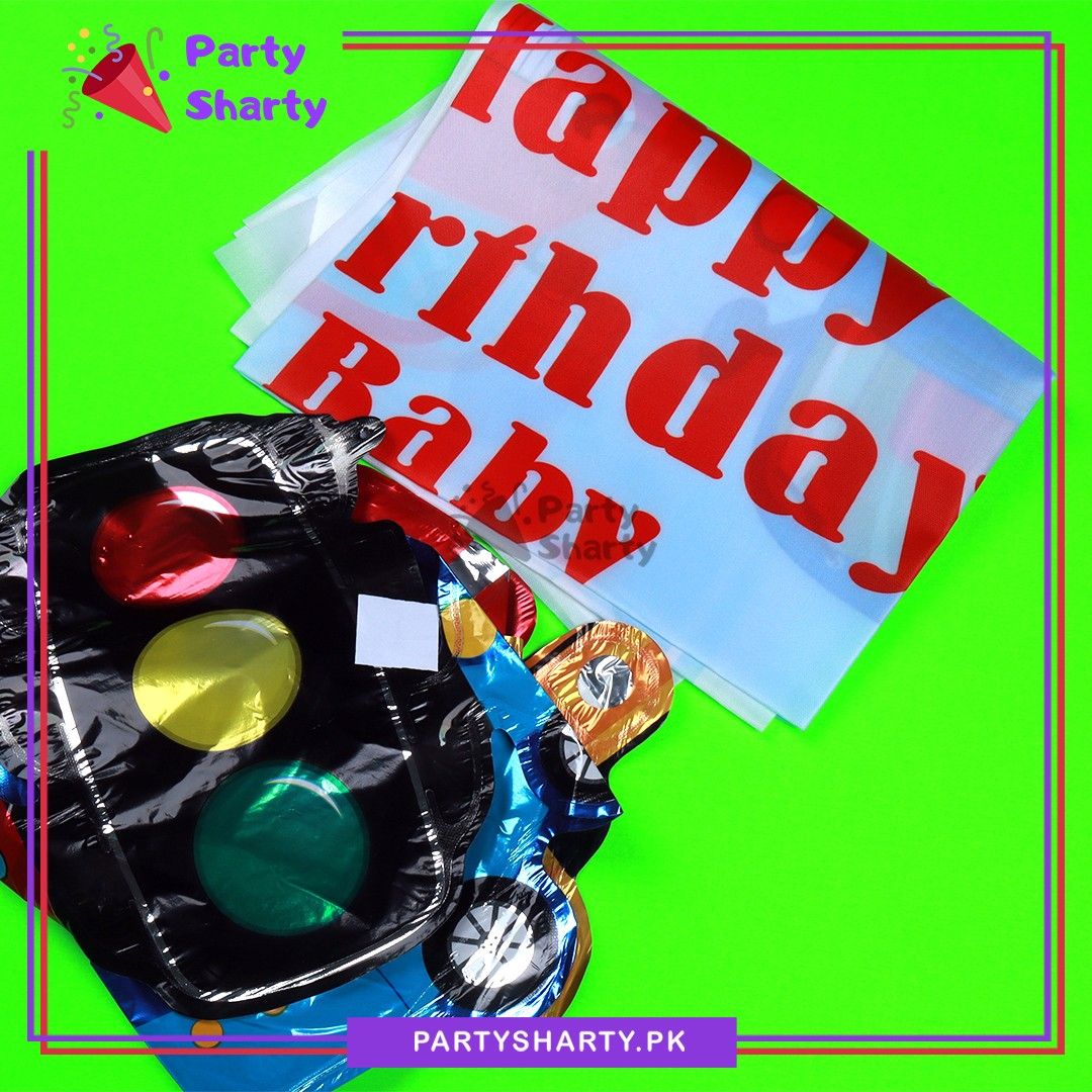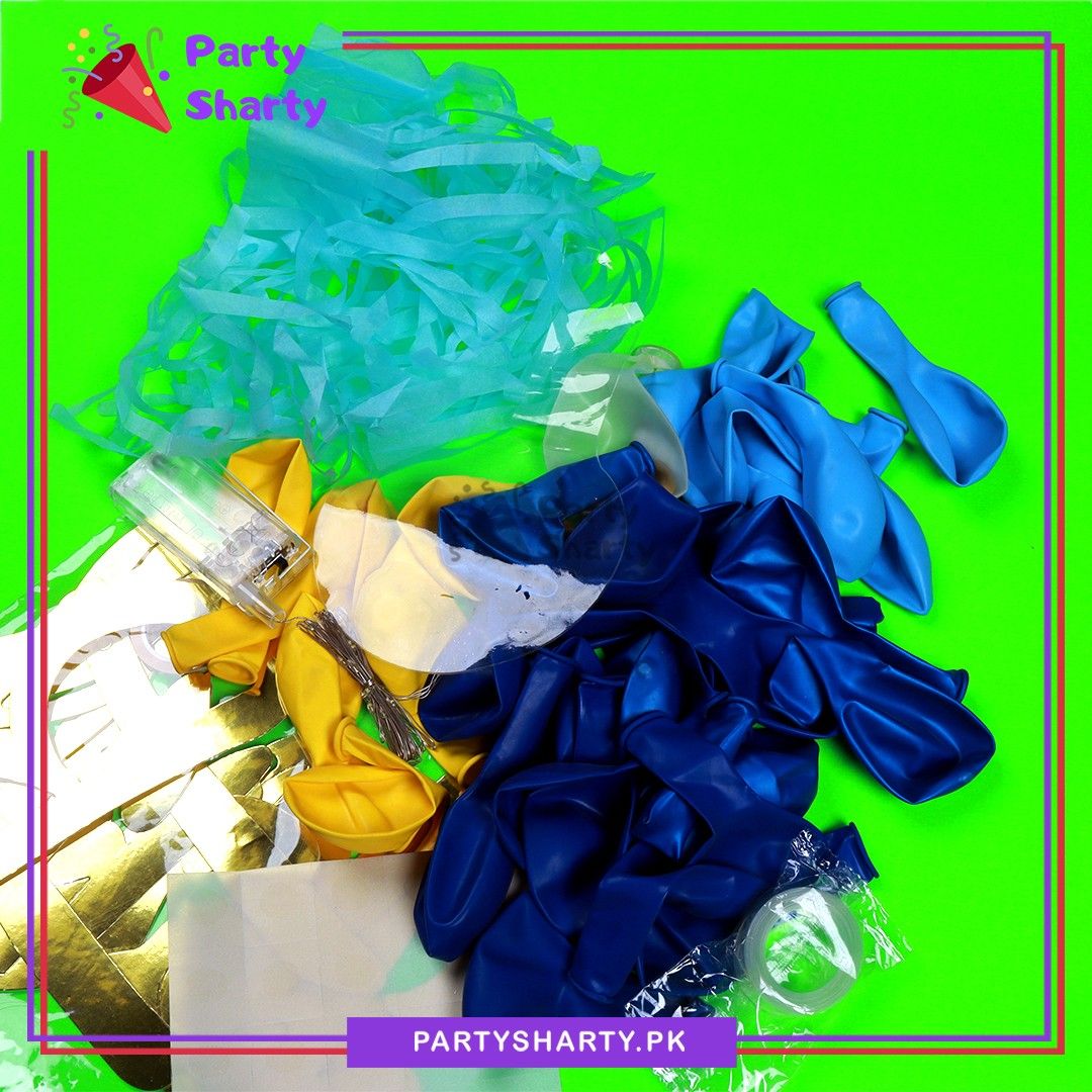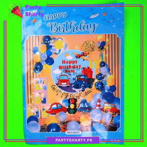 - Packaging Included: 1pc 5in1 joining Transport / Car Garland Foil Balloon (Approx. 103 x 34 cms) + 1pc Golden Scripted Happy Birthday Card Banner + 1pc Transport Theme Poster (Approx. 26x28inches) + 1pc Paper Tassel Light Blue + 1pc 10inches PVC transparent bobo Balloon + 40pcs 10inches Latex Balloons (Dark Blue, Sky Blue & Yellow Mixed) + 1pc Battery operated fairy Light + 1pc golden Confetti Balloon + 1pc Arch tape + 1pc Glue dot sheet.