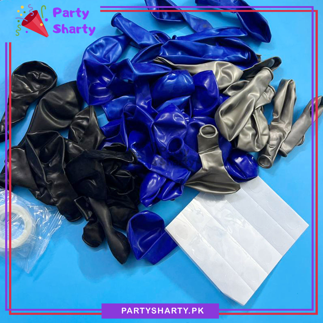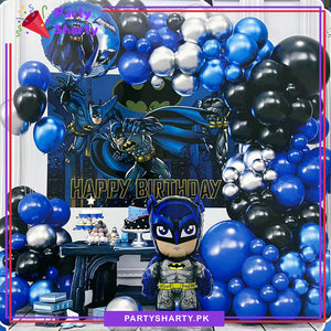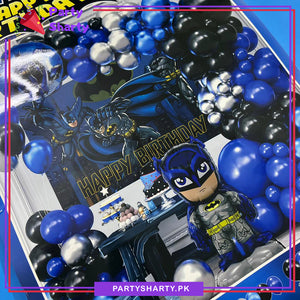 - Package Include: 1pc Batman Theme Banner (30x22 Inches) + 1pc Batman Character Foil Balloon (26 Inches) + 1pc Batman Round Foil Balloon (18 Inches) + 12inches 2pcs Latex Balloons (Black & Dark Blue) + 10inches 40pcs Latex Balloons (Royal Blue, Black & Gray Mixed) + 5inches 10pcs Latex Balloons (Royal Blue, Black & Gray Mixed) + Arch Tape + Dotted Glue Tape + Ribbon