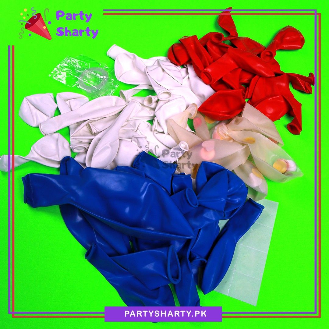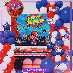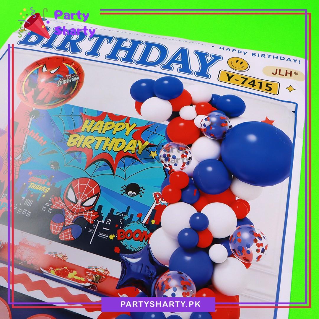 - Package Include: 1pc Happy Birthday Spiderman Theme Banner (Size approx. 26x27 inches) + 18inches 2pcs Latex Balloons + 1pc 18inches Spiderman Round Foil Balloon + 10inches 50pcs Latex Balloons (Dark Blue, White & Red Mixed) + 2pcs 10inches Star Shaped Foil Balloons - Blue + 6pcs 12inches Multi Confetti Balloons + Arch Tape + Glue Dots Sheet