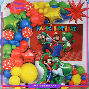 - Package Include: Happy Birthday Banner (Size: Approx. 30x22 inches) + 1pc Super Mario Character Foil Balloon (Approx. Size: 24 inches) + 1pc Red Explosion Star Foil Balloon (Size: Approx. 22 inches) + 3pcs Star Shaped Foil Balloon (Approx. Size: 18 inches) + 5pcs 12inches Red Polka Dots Balloons + 5inches 10pcs Latex Balloons (Yellow, Green, Red & Blue Mixed) + 40pcs 10inches Latex Balloons (Yellow, Green, Red & Blue Mixed) + 12inches 2pcs Latex Balloons (Red & Yellow Mixed) + Dotted Tape Sheet + Arch Tape