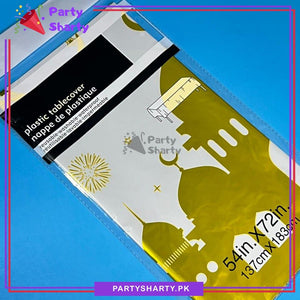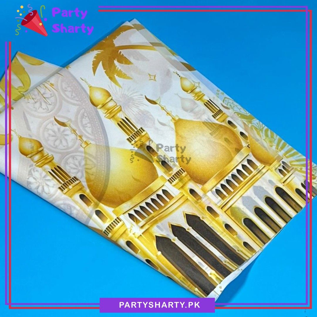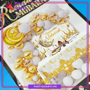 - Package Include: 1pc Ramadan Mubarak Backdrop Poster (Size: Approx. 22x30inches) + 1pc Table Cover (Size: 54x72inches) + 1pc Golden Moon & Star Foil Balloon (Size: 22inches) + 10pcs 12inches Golden Confetti Balloons + 10pcs 5inches Latex Balloons (Golden & White Mixed) + 40pcs 10inches Latex Balloons (Golden & White Mixed) + Dotted Glue Sheet + Arch Tape + Ribbon