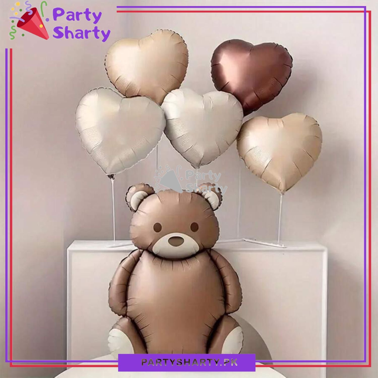 - Package Include: 1pc Matte Teddy Bear Foil Balloon + 5pcs Heart Foil Balloons (Cream, Caramel and Chocolate Brown Mixed)