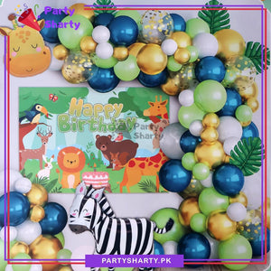 - Package Include: 1pc Happy Birthday Back Drop Banner (Approx. Size: 22x30 inches) + 1pc Zebra Foil Balloon (Size: Approx. 35 inches) + 1pc Cute Giraffe Foil Balloon (Size: Approx. 23 inches) + 6pcs 12inches Confetti Balloons + 10 inches 50pcs Latex Balloons (White, Blue, Lime Green, Golden & Sand White mixed) + 10pcs 5inches Latex Balloons (White, Sand White, Lime Green & Golden mixed) + 4pcs Artificial Paper Card Leaves + Arch tape + Dotted tape Sheet