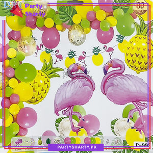 - Package Include: 2pcs Foil Flamingo Balloon (Size: 40 Inches) + 2pcs Foil Pineapple Foil Balloons (Size: 38 Inches) + 3pcs Green Leaves Card + 5pcs Golden Confetti Balloons + 5inches 30pcs Latex Balloons (Yellow, Baby Pink & Light Green mixed) + 10inches 35pcs Latex Balloons (Yellow, Baby Pink & Light Green mixed) + Arch Tape + Dotted Glue Tape