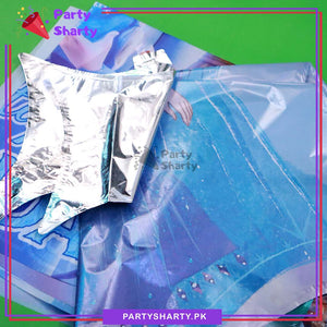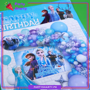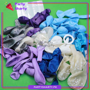 - Package Include: Happy Birthday Banner (Size Approx. 30x22 inches) + 1pc Frozen Elsa Character Foil Balloon (approx. 27 Inches) + 1pc Frozen Theme Round Foil Balloon (Size: Approx. 18 inches) + 10inches 2pcs Silver Four Point Star Foil Balloons + 12inches 5pcs Silver Confetti Balloons + 12inches 5pcs Snow Flake Printed Transparent Balloons + 12inches 2pcs Latex/ Metallic Balloons (Blue & Purple) + 10inches 50pcs Latex / Metallic Balloons (Blue, Purple, White & Silver Mixed) + 5inches 10pcs Latex Balloons (Blue, Purple, White & Silver Mixed) + Ribbon + Dotted Glue Tape Sheet + Arch Tape