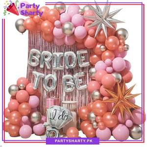 - Package include: 1pc Rose Gold Foil Curtain + 1set Silver Bride To Be Foil Banner + 2pcs 22inches Explosion Star Foil Balloons (Rose Gold & Silver) + 1pc 26inches I DO Ring Shaped Foil Balloon + 15pcs 5inches Latex Balloons (Rose Gold, Silver Grey & Baby Pink mixed) + 60pcs 10inches Latex Balloons (Rose Gold, Silver Grey, Baby Pink & Retro Pink mixed) + Ribbon + Arch Tape + Glue dot Sheet