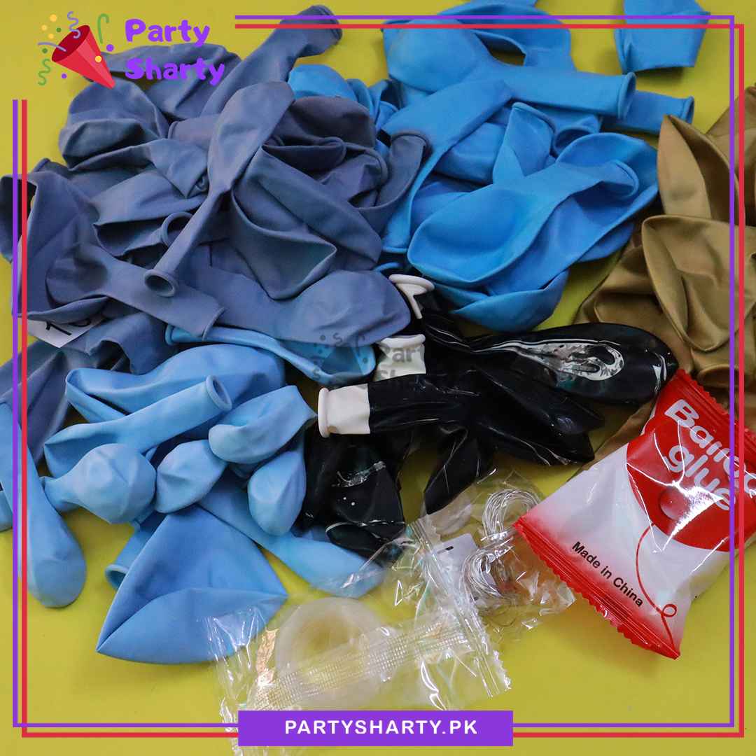 - Party Decoration Kit includes: 13pcs Happy Birthday Foil Banner - Golden + 12inches 4pcs Latex Balloons (Dusty Blue & Baby Blue Mixed) + 10inches 6pcs Marble Black Balloons + 10inches 8pcs Golden Balloons + 10 inches 40pcs Latex Balloons (Dusty Blue & Baby Blue Mixed) + 5inches 10pcs Latex Balloons (Dusty Blue & Baby Blue Mixed) + Arch Tape + Dotted Glue Tape + Fairy Light.