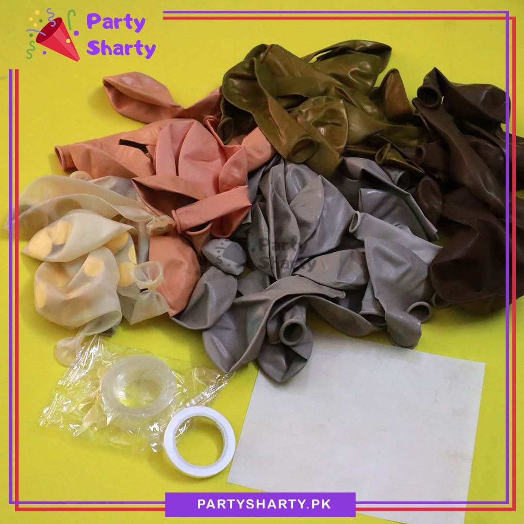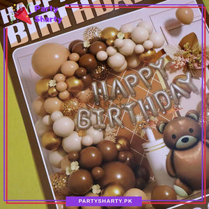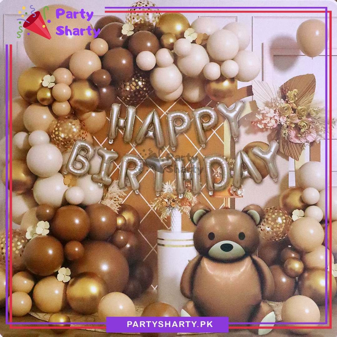 - Party Decoration Kit includes: 13pcs Happy Birthday Foil Banner - Caramel (Size: 16 inches each alphabet) + 12 inches 2 pcs Latex Balloons (Apricot & Mocha Brown Mixed) + 10 inches 50 pcs Latex Balloons (Apricot, Mocha Brown, Golden & Sand White mixed) + 5 inches 10 pcs Latex Balloons (Apricot, Mocha Brown, Golden & Sand White Mixed) + 1pc 32inches Teddy Bear Foil Balloon + 5pcs Confetti Balloons - Golden + Arch Tape + Dotted Glue Sheet + Ribbon