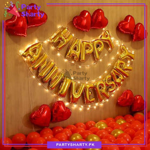 - Package Include: Happy Anniversary Foil Balloon + 12pcs 18 inches Heart Shaped Foil Balloon + 60pcs Latex Balloons + 10pcs Golden Chrome Balloons + Dotted Tape + Fairy Light Electric Operated