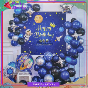 - Package Include: Spaceman Theme Banner (Approx. 27 inches) + Approx. 40pcs Latex Balloons (Blue, Black and Silver/Grey Mixed) - Pack of 1 Star Foil Balloon - 5 inches (Silver) + Pack of 4 Star Foil Balloon - 4 point (Silver) + Space Theme Round Foil Balloon + 1pc Rocket Foil Balloon + Arch Tape + Ribbon + Glue Dots Sheet