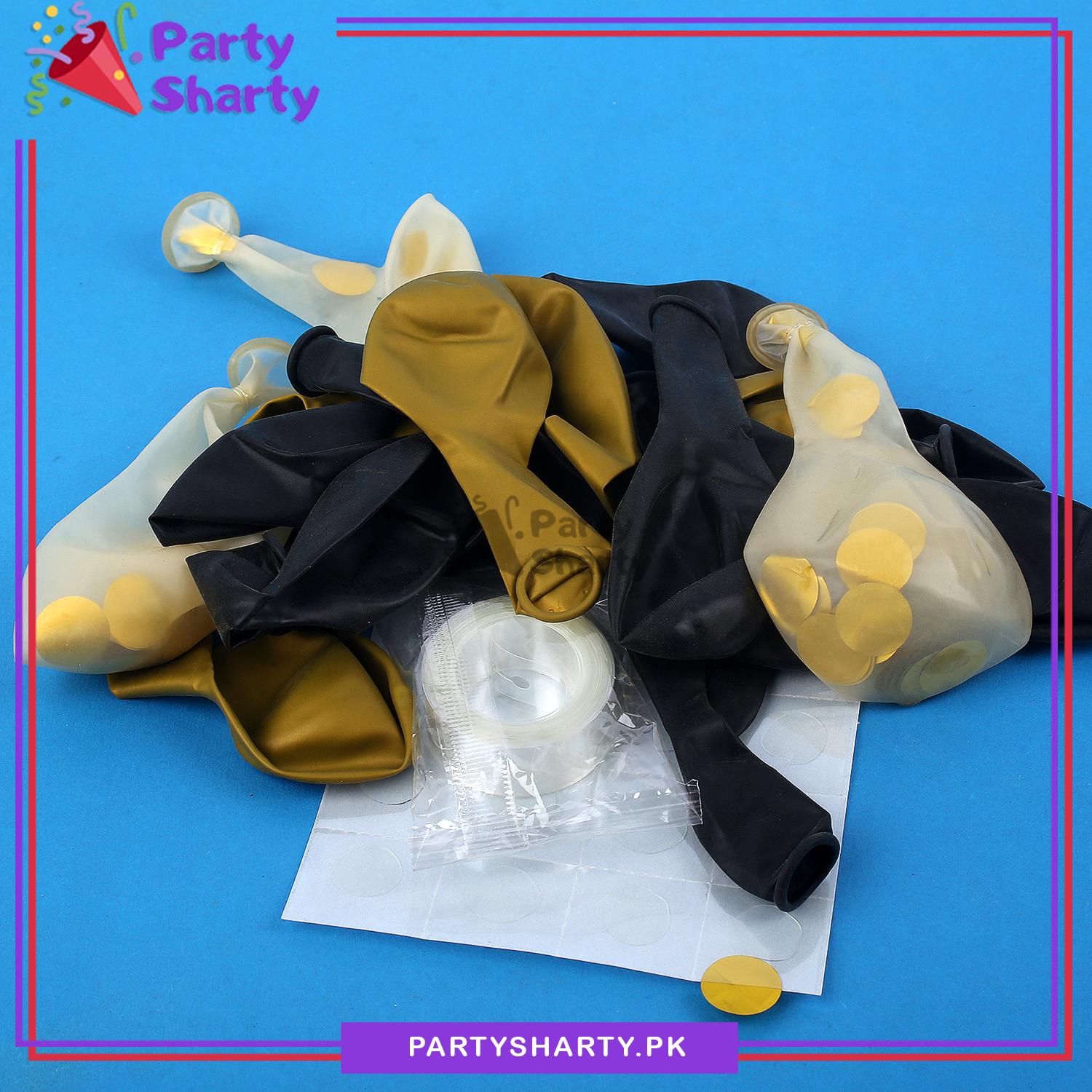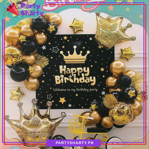 - Package Include: Black and Golden Birthday Banner (Approx. 28 x 26 inches) + 2pcs Small Golden Crown Foil Balloon - 10 inches + 5pcs Star Foil Balloon - 5 inches + 3pcs Star Shaped Foil Balloon - 10 inches + 1pc Golden Artificial Leave + 3pcs Golden Confetti Filled Latex Balloons + Approx. 35pcs Latex Balloons (Black & Golden Mixed) + Arch Tape + Glue Dots Sheet