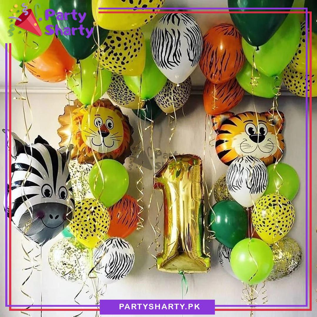 - Package Include: 1st Number Foil Balloon - Golden (Size: 32 inches) + 20pcs 12 inches Animal Print Balloon (White Zebra Print, Orange Tiger Print, Yellow Leopard Print)+ 3pcs Animal Head Foil Balloon (Size: Approx. 25 inches) + 10 pcs 10 inches Latex Balloons (Green & Light Green Mixed) + 2pcs 10 meter Golden Curly Ribbons Roll For Balloons