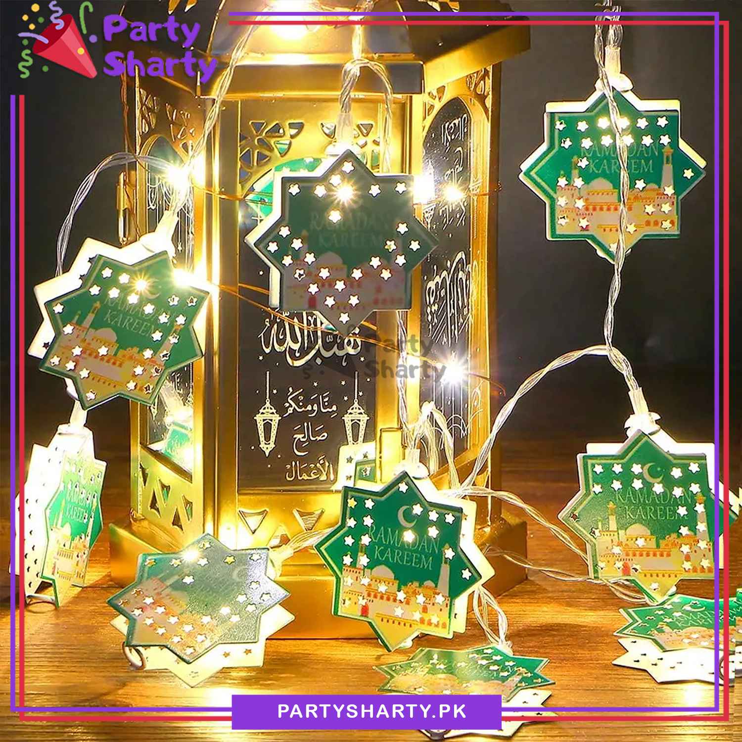 Green Color Ramadan Kareem With Masjid Printed Star Shaped Led Metal String Lights For Ramadan Iftar Party Celebration
