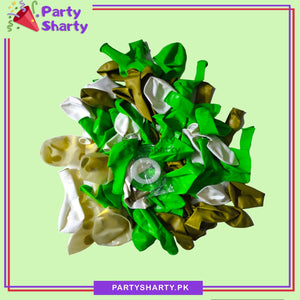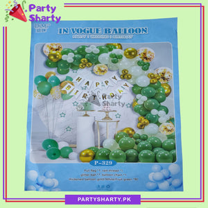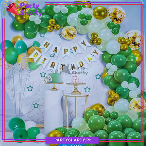 - Package Include: Happy Birthday Card Banner (White) + 80pc Latex / Metallic Balloon (Golden, Green & White Mixed) + 7pcs Confetti Balloons + Arch tape + Foil Strip