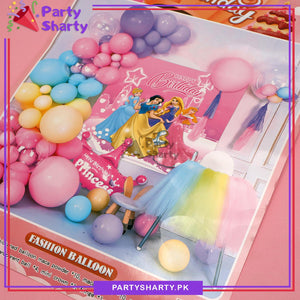 - Package Include: Princess Theme Banner (Approx. 28x26 inches) + Paper Tassel - Baby Pink + Princess Crown Foil Balloon - Pink (Size: Approx. 16 inches) + 10pcs Yellow Macron Balloons + 10pcs Macron Sea Green Balloons + 10pcs Baby Pink Macron Balloons + 10pcs Purple Macron Balloons + 4pcs Transparent Latex Balloons + Arch Tape + Glue Dots Sheet