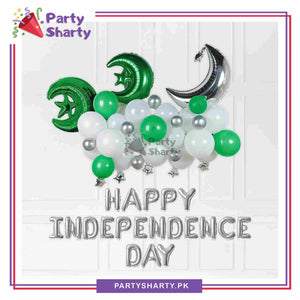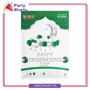 - Package Include: Happy Independence Day Foil Banner (Size: 16 inches each alphabet) + 1pc 28inches Silver Crescent Moon Foil Balloon + 2pc 18inches Green Moon Star Foil Balloons +5inches 6pcs Silver Star Foil Balloons + 12inches 20pcs Latex Balloons (Green & White Mixed) + 5inches 28pcs Latex Balloons (Green, White & Silver Metallic Mixed) + 5inches 8pcs Silver Confetti Filled Latex Balloons + Arch Tape + Ribbon