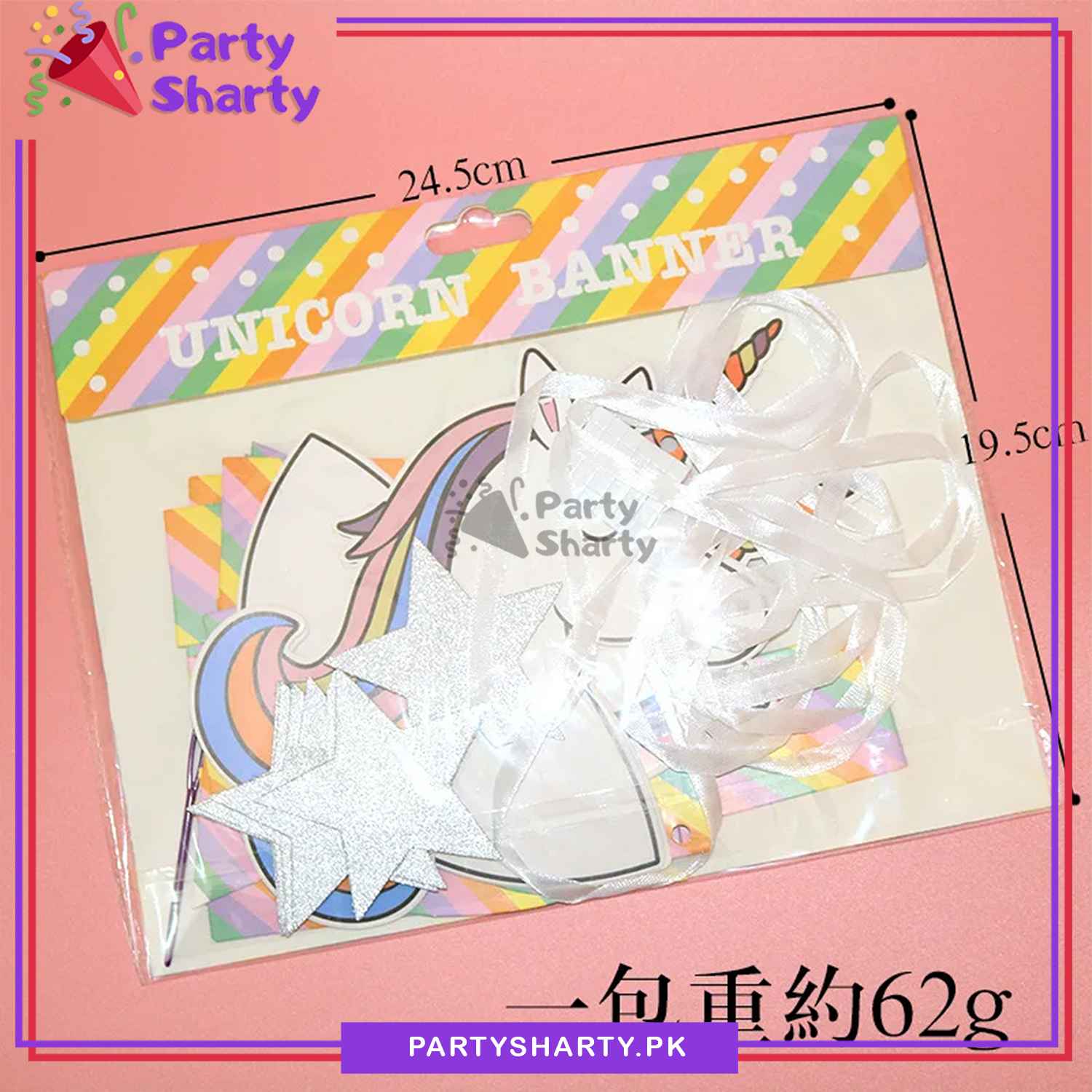1 x Happy Birthday banner, composed of 13 letter cards + 6 Silver Glittered Star Shaped + 3 Unicorn Shaped Card
